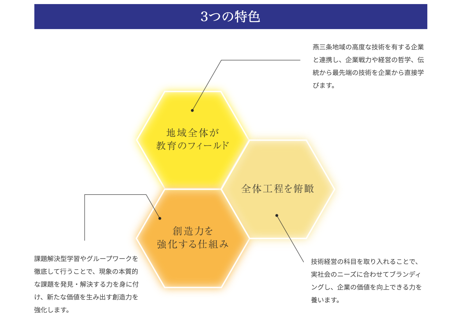 そして、企業の財産となり得る人材を輩出することで個々の企業価値を高めるとともに、この地のものづくりの持続的発展に貢献していきます。